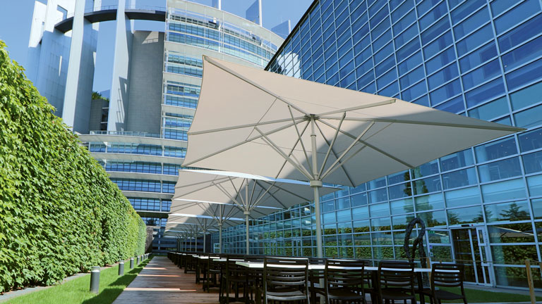 Der runde Ampelschirm mit besonders robustem Aufbau für den gewerblichen Bereich, wo Sicherheit und Stabilität wichtig sind.
